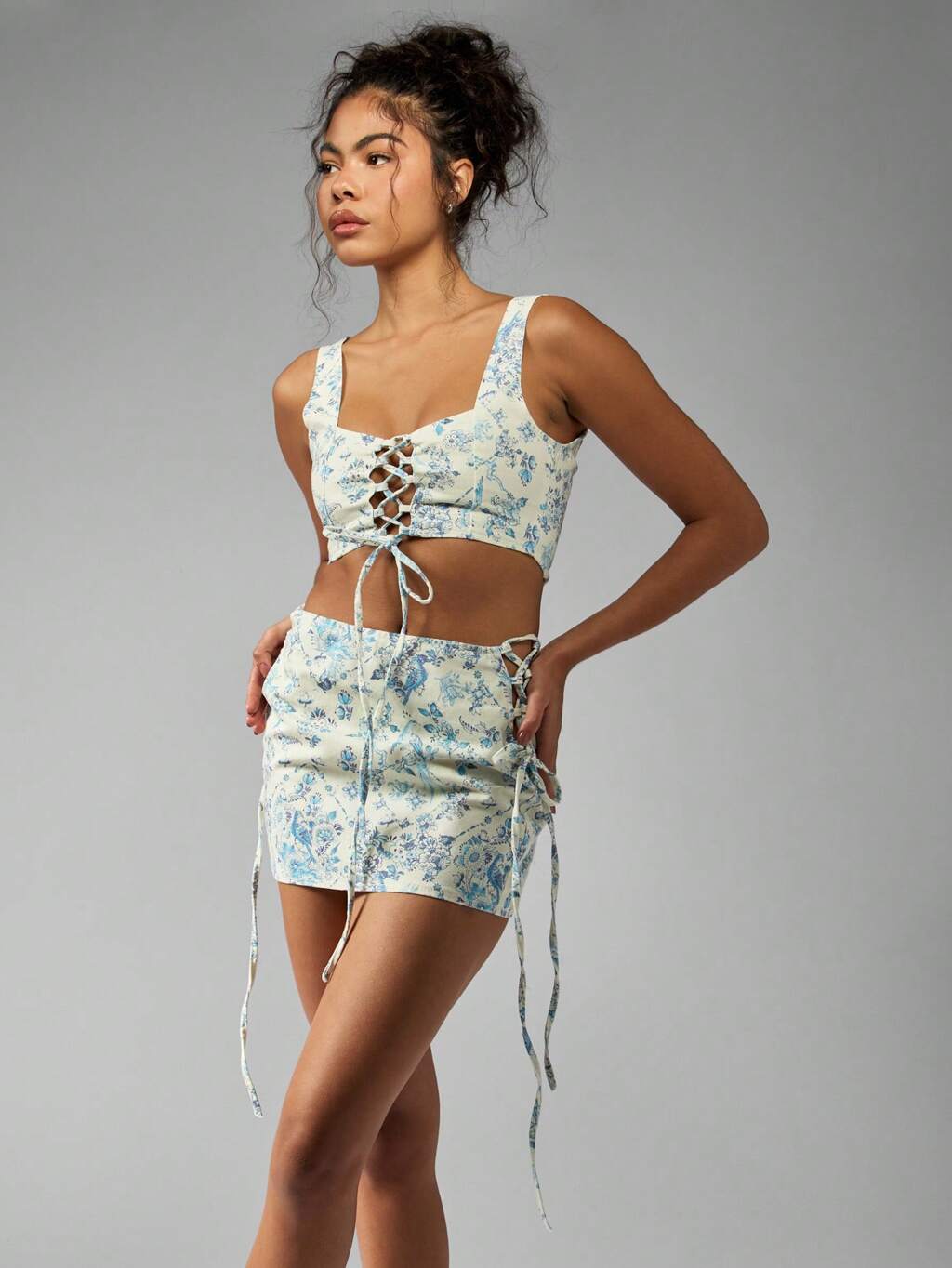 MISSGUIDED Minigonna in denim con lacci laterali e stampa floreale in porcellana