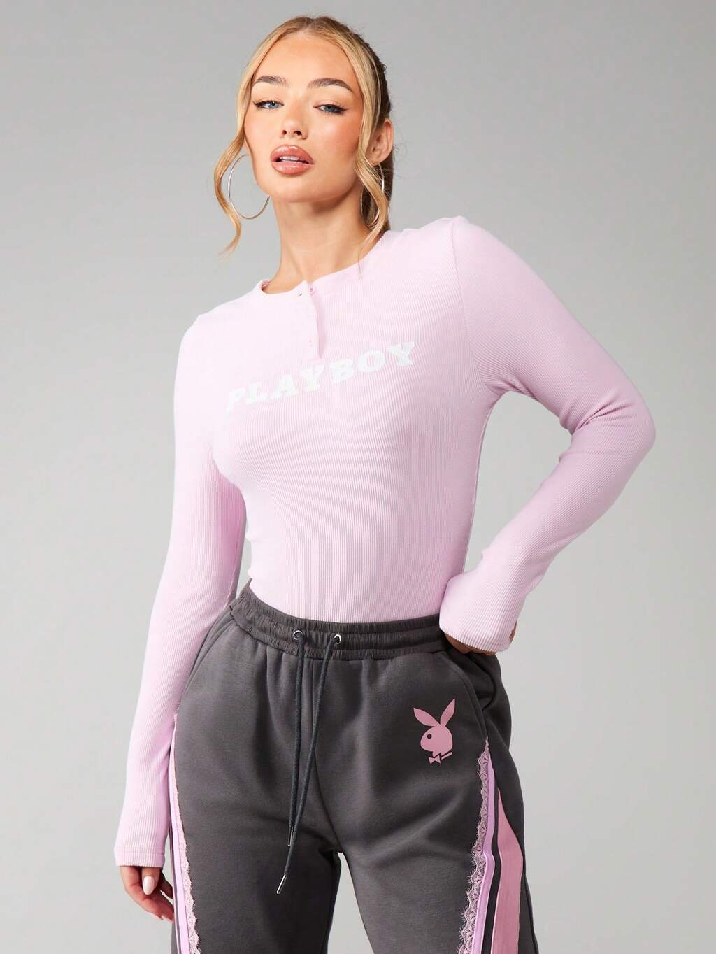 Missguided x Playboy リブ編みロングスリーブヘンリーボディスーツ