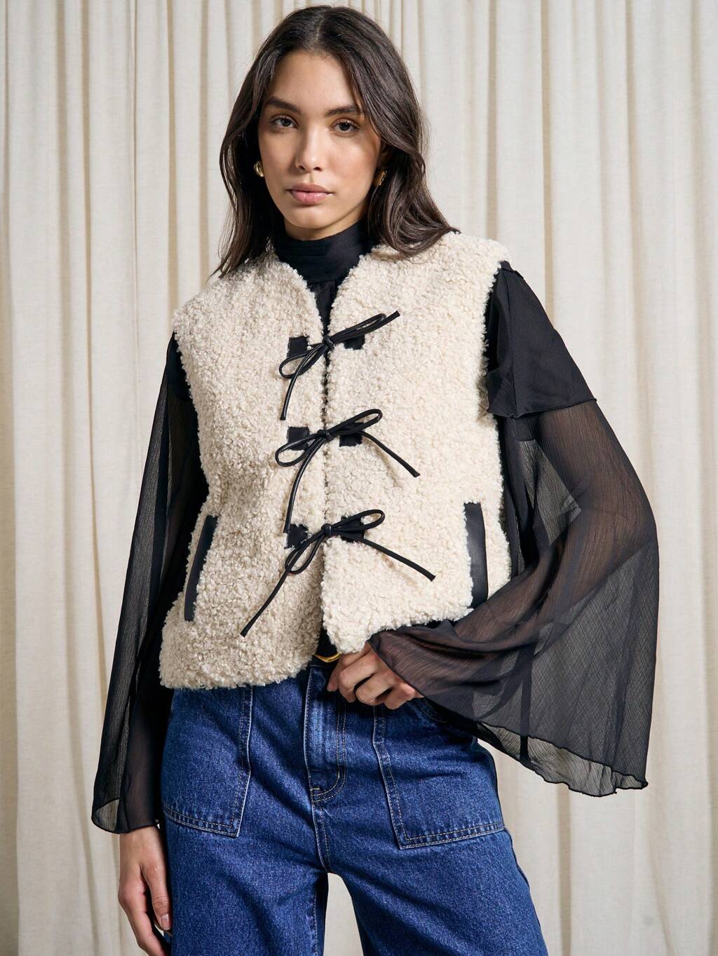 AiiRZ ボウタイデザイン ワンピース ウィンター シェルパ テディベア ベスト ノースリーブ アウター 暖かい レイヤリング 秋ファッション ふわふわジレ