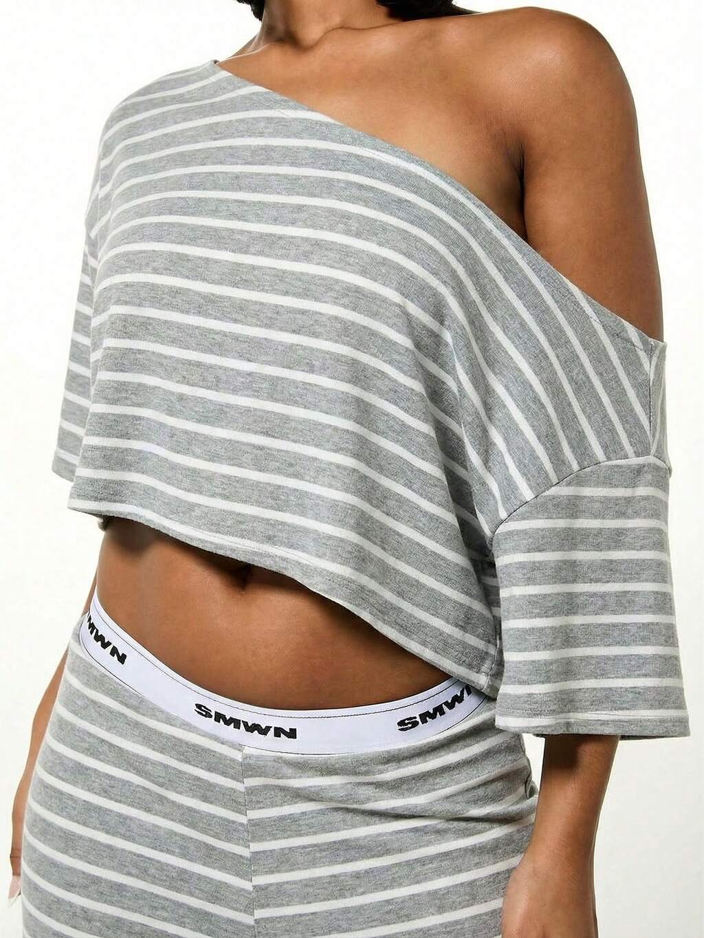 SUMWON WOMEN 女性用ストライプオフショルダーラウンジトップ、快適でリラックスしたフィット、カジュアルな週末ウェア、ソフトなリブニット