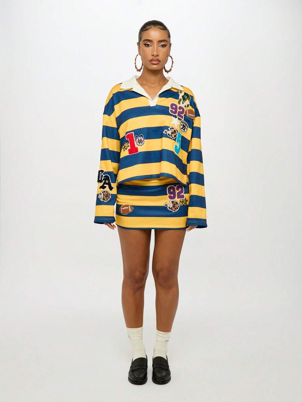 SUMWON WOMEN ラグビーストライプ カレッジスタイル スウェットシャツ パッチ付き レトロスポーツナンバー フットボール 秋冬 Y2Kファッション