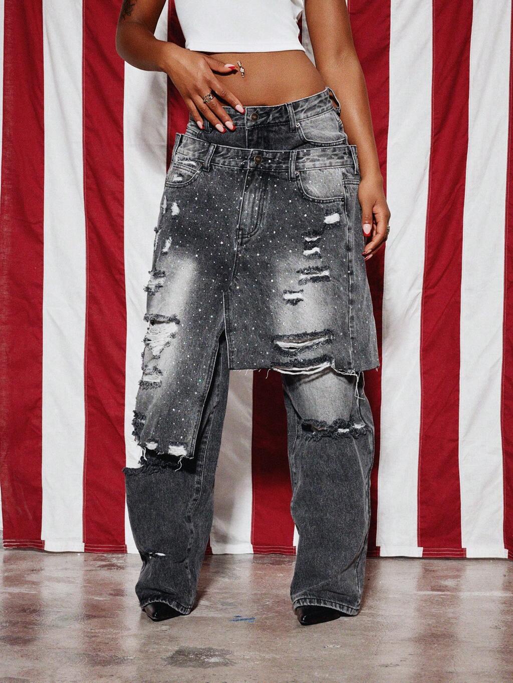 SUMWON WOMEN フェスティバル スパークリングスター ワイドレッグ ダメージ加工 エッジィ ダブルレイヤー 2-in-1 ジーンズ ヒップホップ ストリートウェア