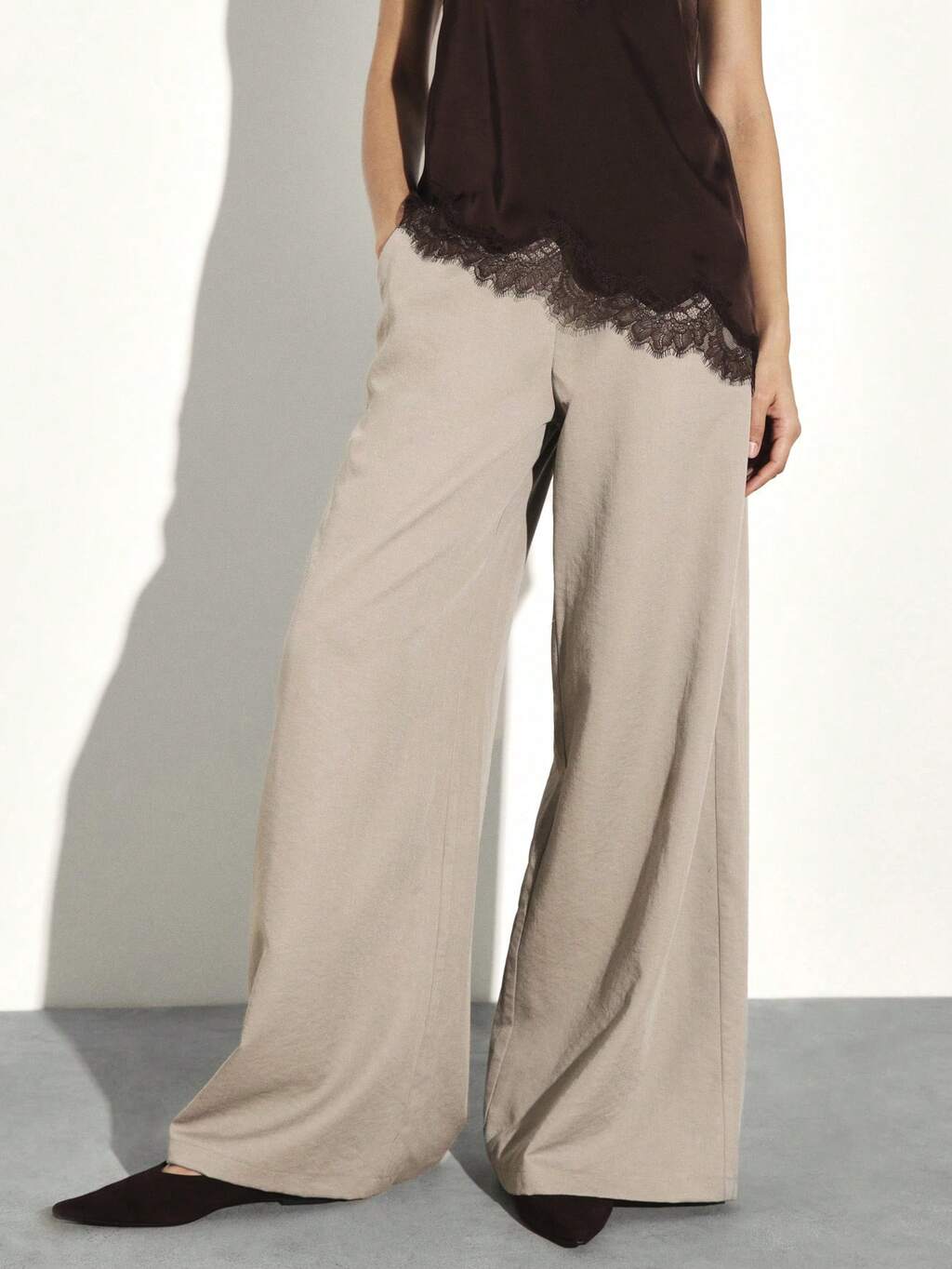AiiRZ 女性用 ブラックレース ワイドレッグパレッツォパンツ、繊細なフローラルパターン、ハイライズ、エレガントなイブニングパンツ