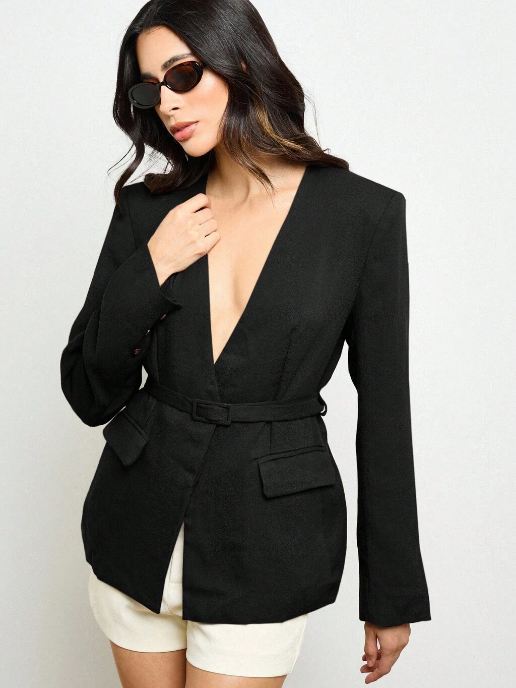 MISSGUIDED ラペルカラーとサイドポケット付きのベルト付きテーラードブレザー