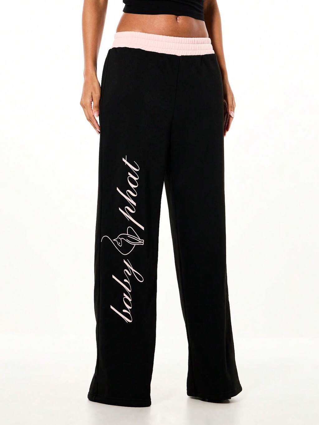 BABYPHAT バレンタインデー用のピンクウエストバンド付きコントラストディテールワイドレッグスウェットパンツ、スクリプトテキスト入り