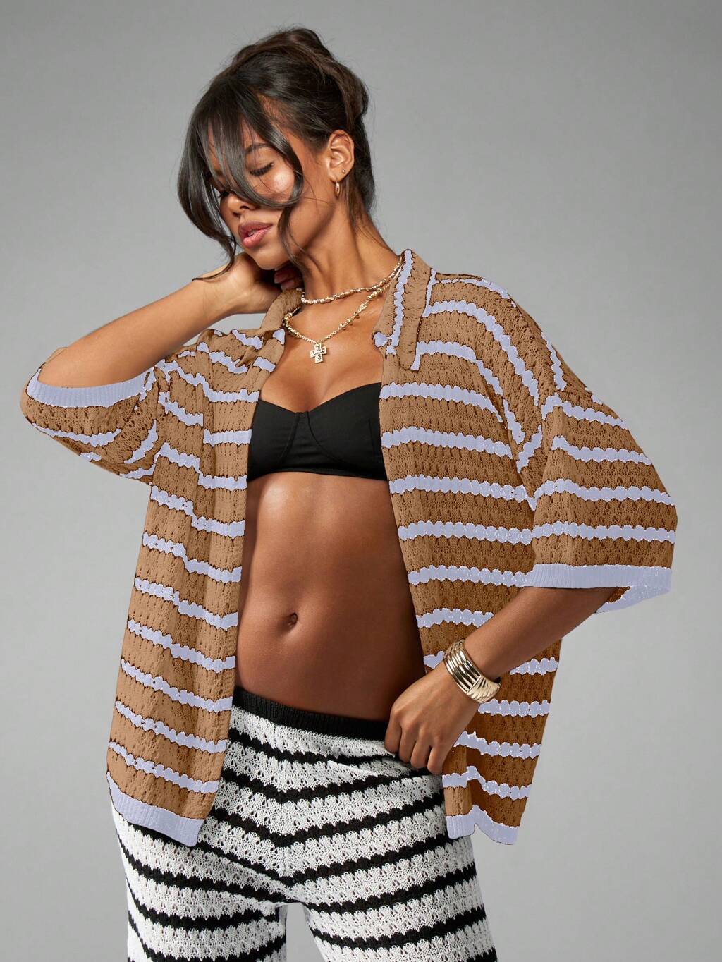 MISSGUIDED リブトリム付きボタンフロントストライプニットカーディガン