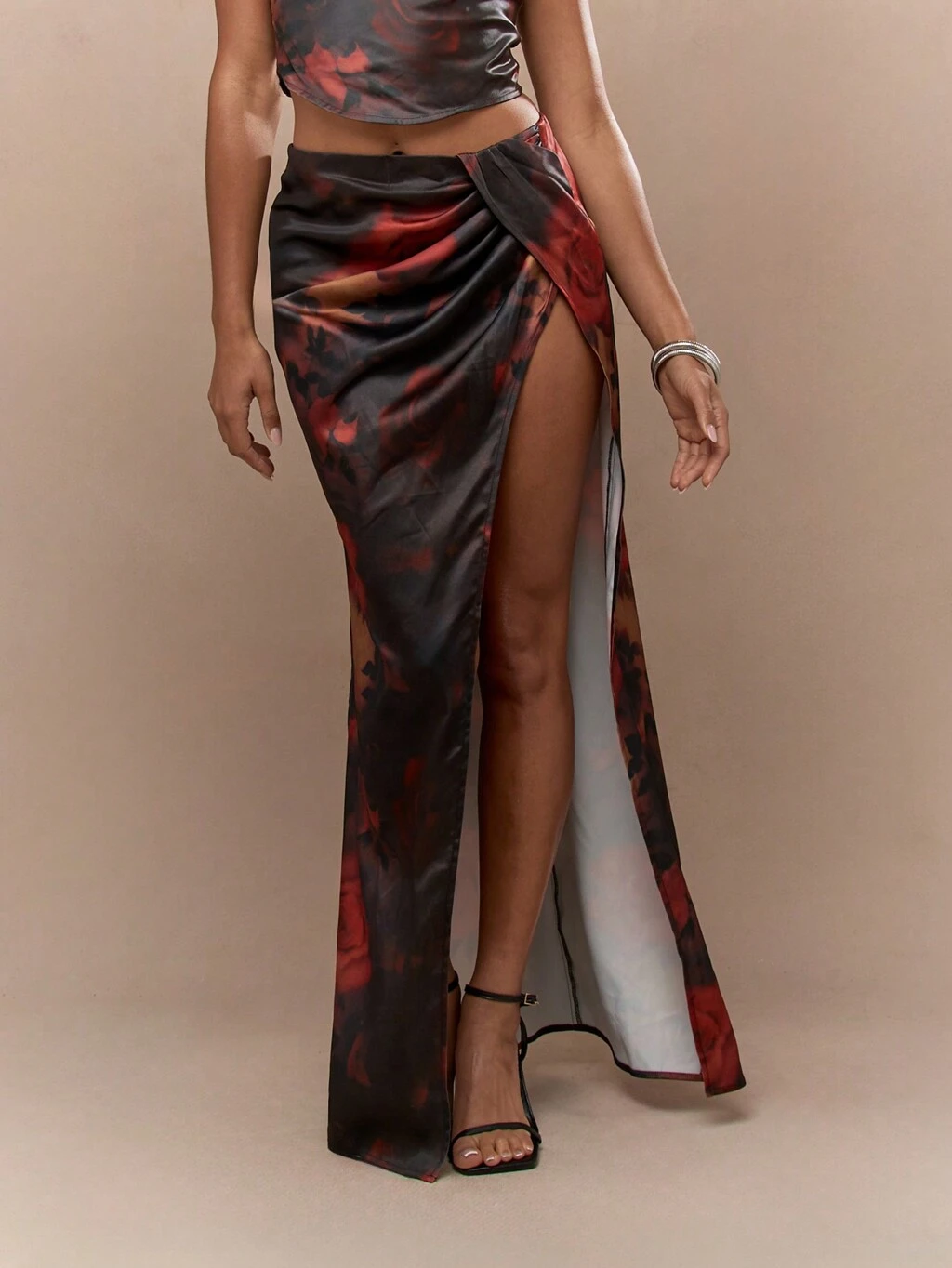MISSGUIDED フローラル柄サテン サイドスリット入りマキシスカート