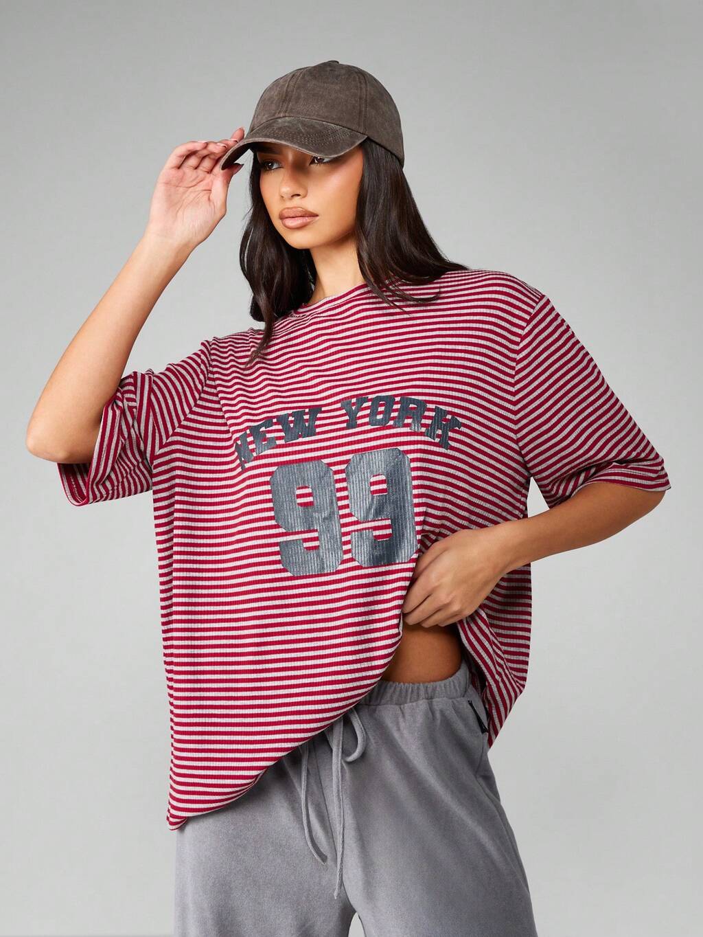 MISSGUIDED バーシティナンバープリントの赤いストライプTシャツ