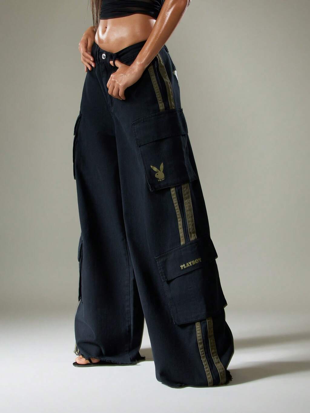 Missguided x Playboy 裾にダメージ加工を施したワイドレッグカーゴパンツ