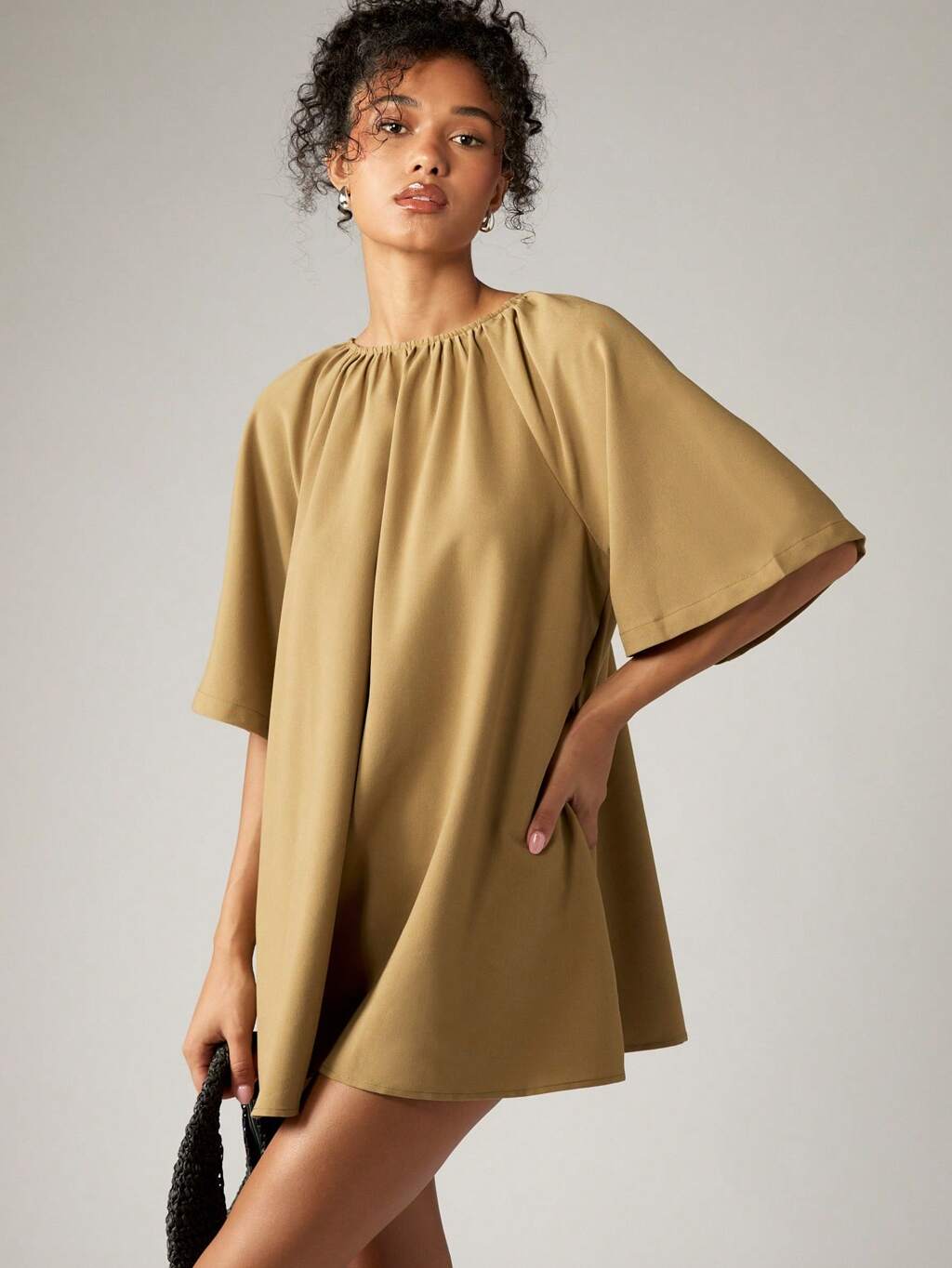 AiiRZ 優雅なラグランスリーブミニAラインドレス、ギャザー入りネック、軽やかなドレープ、フローイング、夏秋のイブニングドレス、膝丈、エンパイア、バックタイ付き