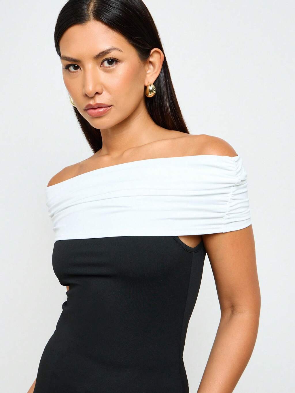AiiRZ 오프 숄더 러쉬드 밴도 스타일 현대적 디자인 모던 미니멀리스트 이브닝 파티 캐주얼 클럽 나이트아웃 패션 포워드 스테이트먼트
