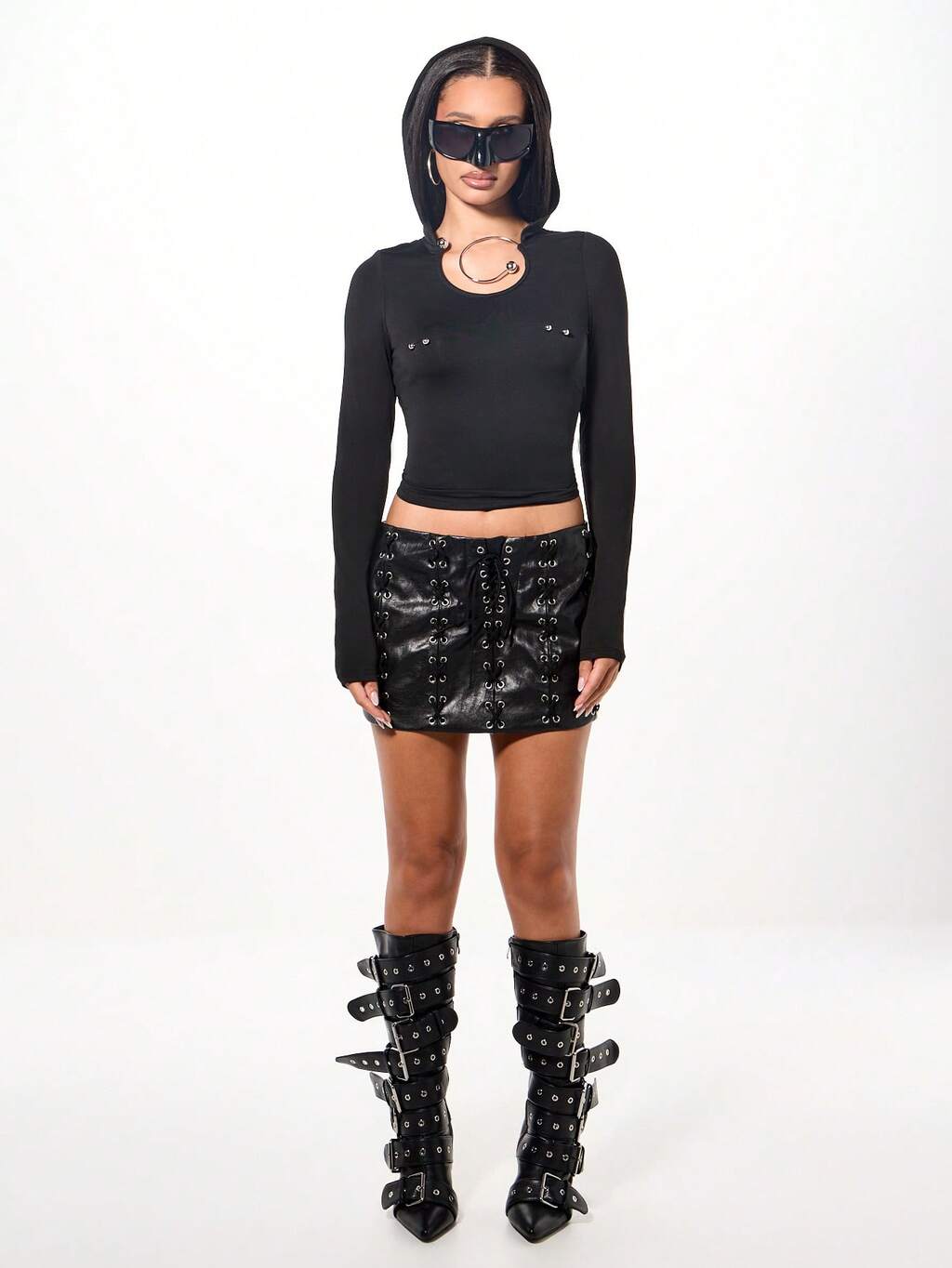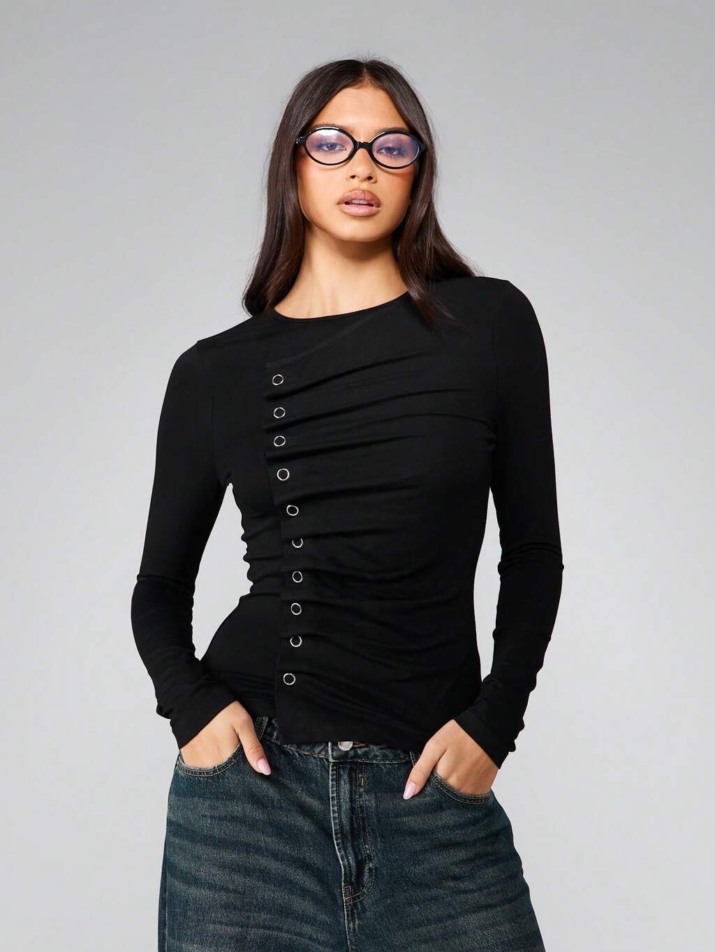 MISSGUIDED 금속 구멍이 있는 긴팔 버튼 디테일 탑