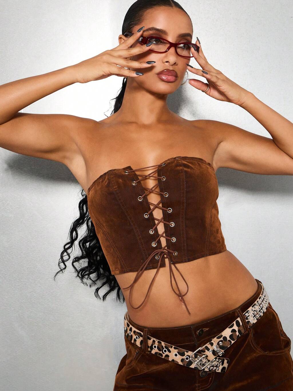 SUMWON WOMEN 이브닝 파티 클럽 웨어 가을 겨울 패션 미학 Y2K 스타일을 위한 앞면 레이스 업 디테일이 있는 고급스러운 벨벳 코르셋 크롭 탑