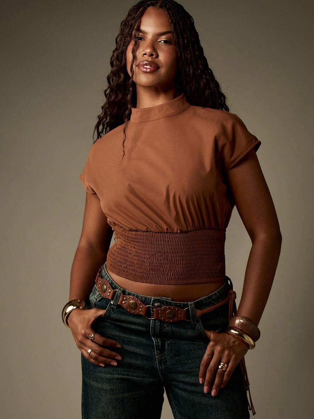MISSGUIDED 셔링 밴드가 달린 하이넥 신치드 웨이스트 크롭 탑