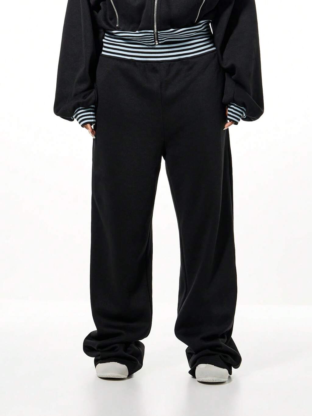 SUMWON WOMEN 대비되는 흰색 스트라이프 디테일이 있는 오버사이즈 블랙 조거, 탄성 허리 밴드 캐주얼 스웨트팬츠