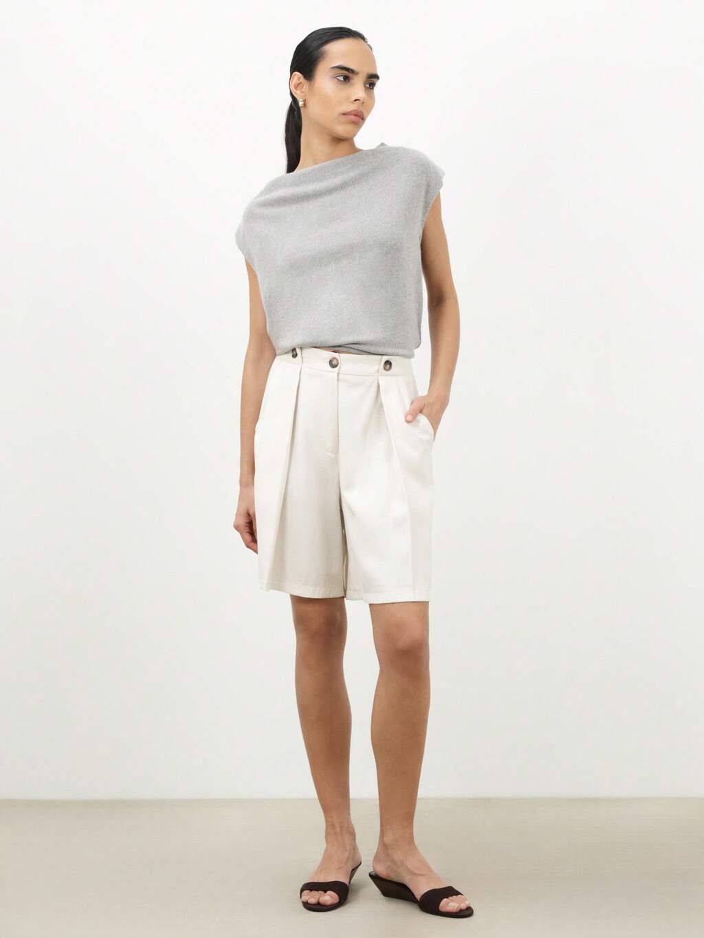 KSTM 여성용 하이웨이스트 버튼 디테일 버뮤다 쇼츠 여름 캐주얼 와이드 레그 테일러드 치노 스타일 무릎 길이 플리츠 프론트 포켓