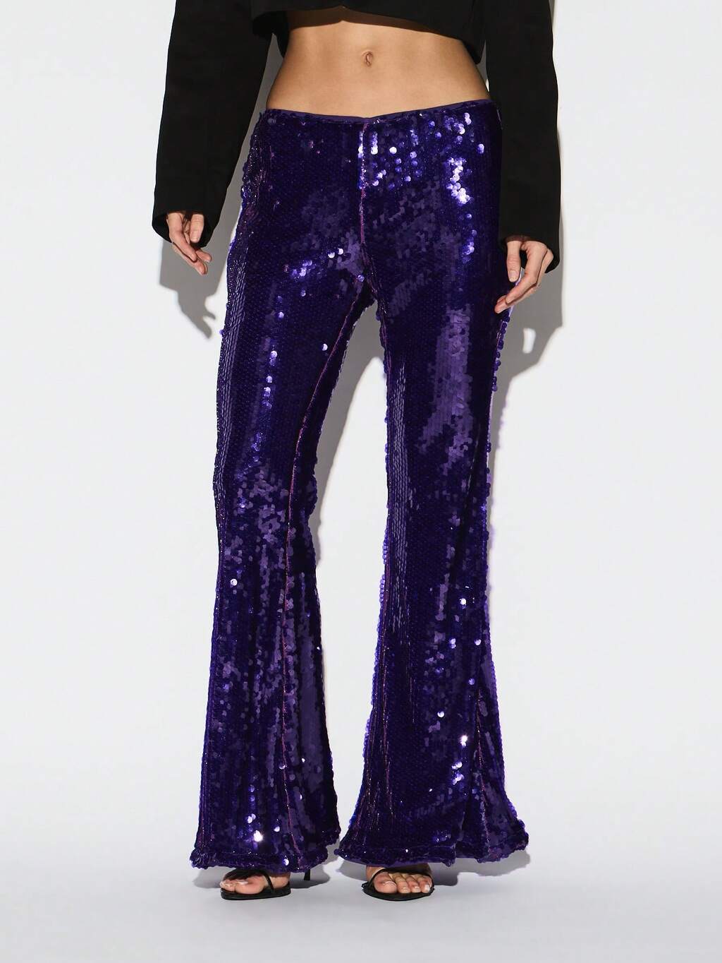 KIZN 로우 라이즈 스팽글 플레어 팬츠 퍼플 벨 보텀 디스코 파티 클럽 나이트 아웃 스파클리 글리터리