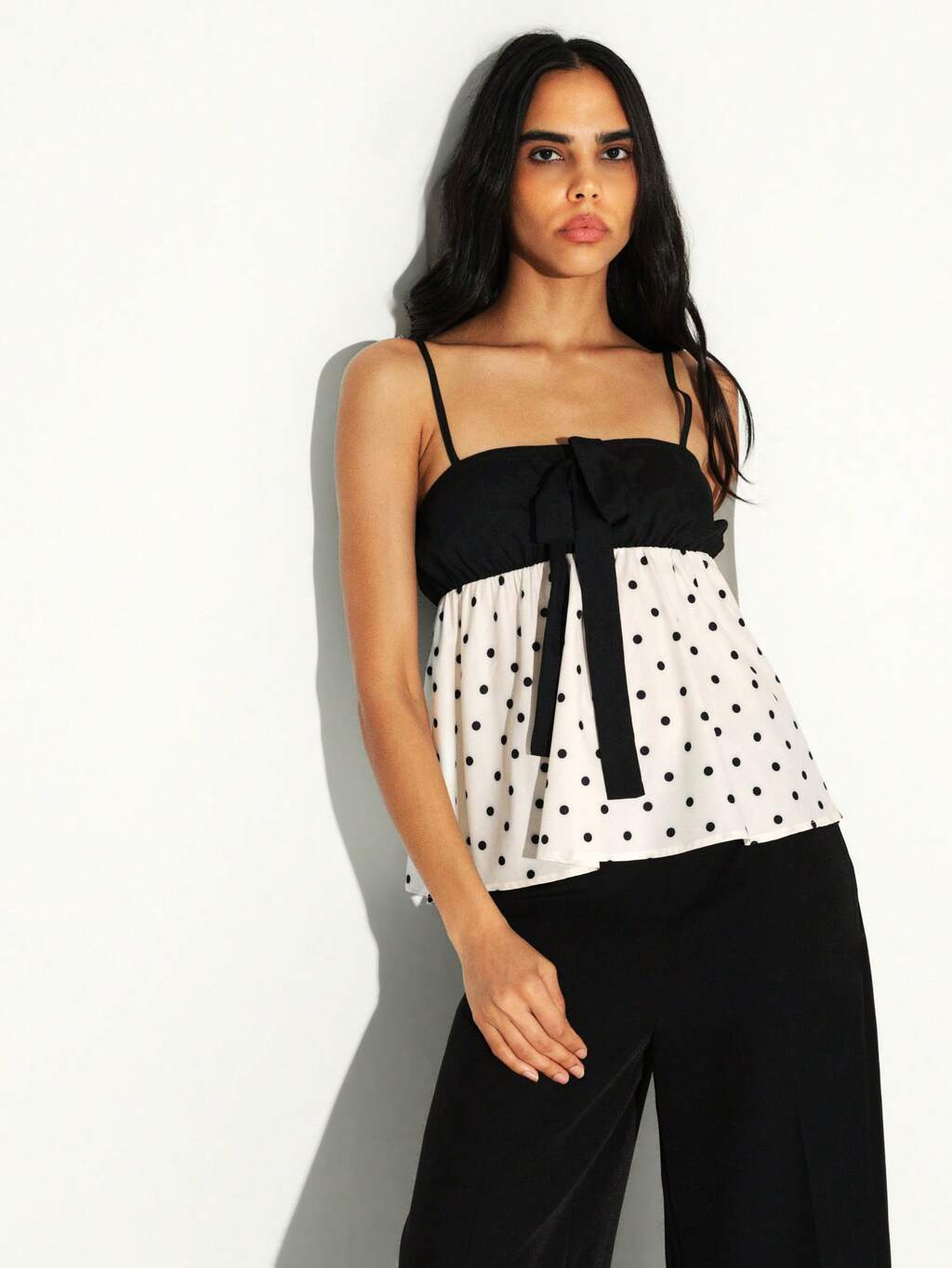 KSTM 물방울 무늬 타이 프론트 디테일 탱크 탑 뷔스티에 캐미솔 스파게티 스트랩 여름 캐주얼 블랙 화이트 대비