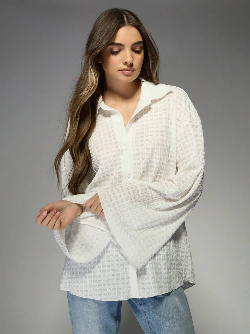 MISSGUIDED 텍스처 버튼다운 벨 슬리브 오버사이즈 블라우스