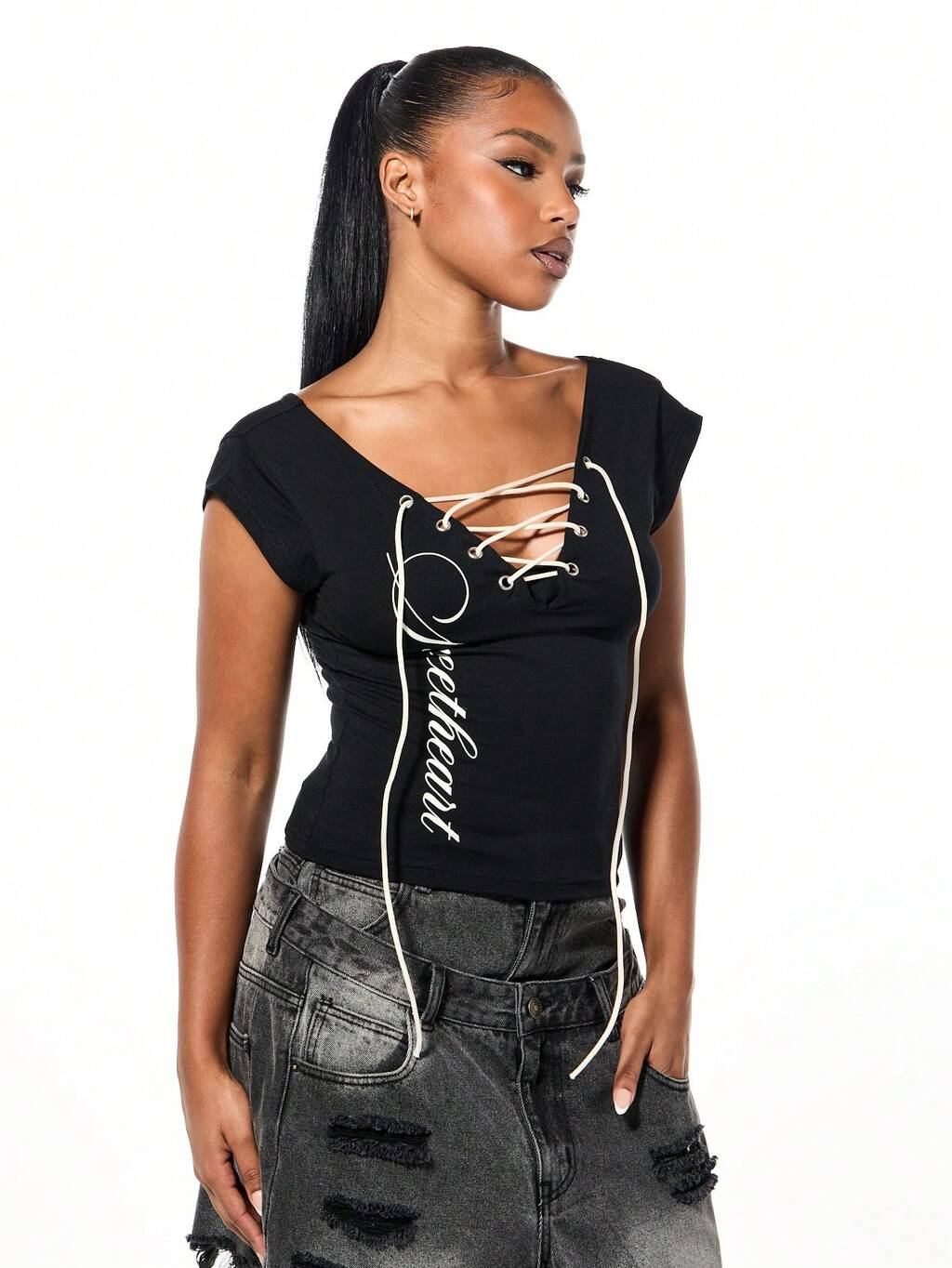 SUMWON WOMEN 그래픽 프린트와 타이 프론트 디테일이 있는 레이스업 크롭 탑, 축제 및 캐주얼 웨어용