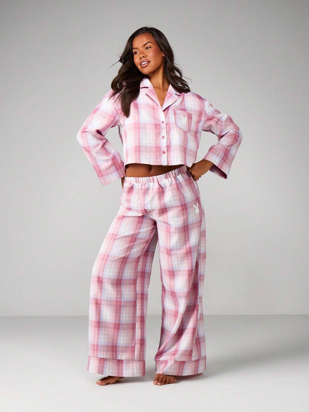 Missguided x Playboy 크리스마스 체크무늬 크롭 셔츠와 와이드 레그 파자마 세트