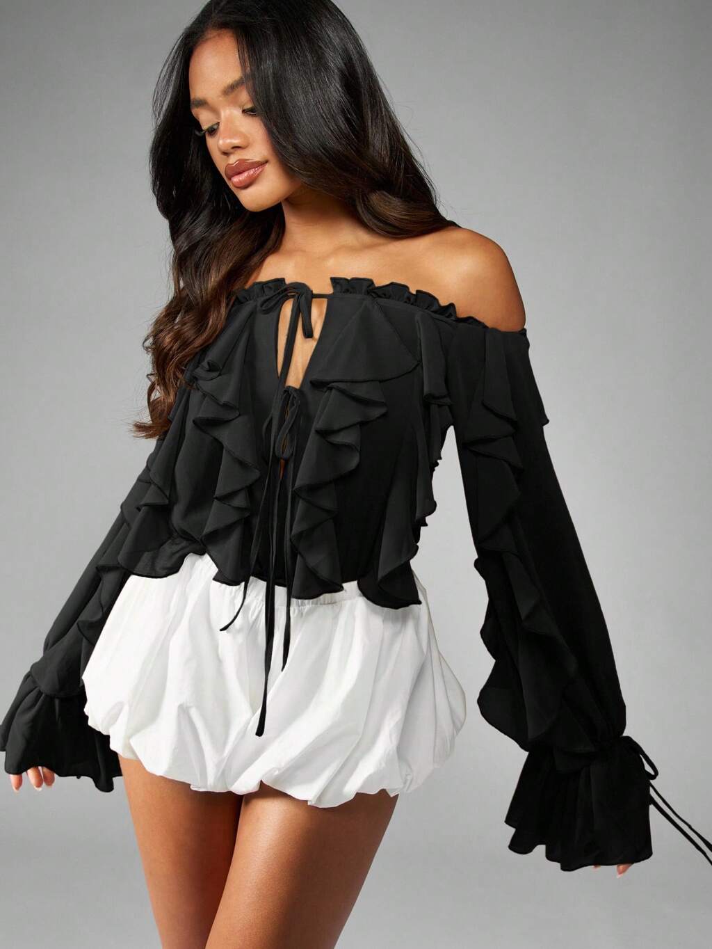 MISSGUIDED 벨 슬리브와 버블 헴이 있는 러플 쉬폰 바디수트