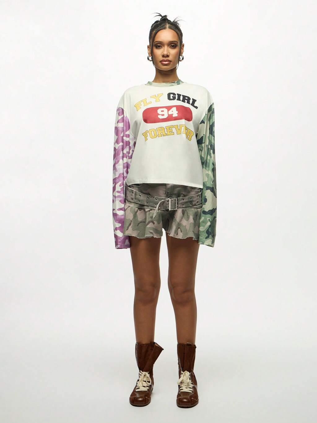 SUMWON WOMEN 94 포에버 걸 오버사이즈 긴팔 스웨트셔츠 위장 믹스 컬러 블록 소매 디자인 가을 겨울 캐주얼 스트리트웨어 그래픽 탑
