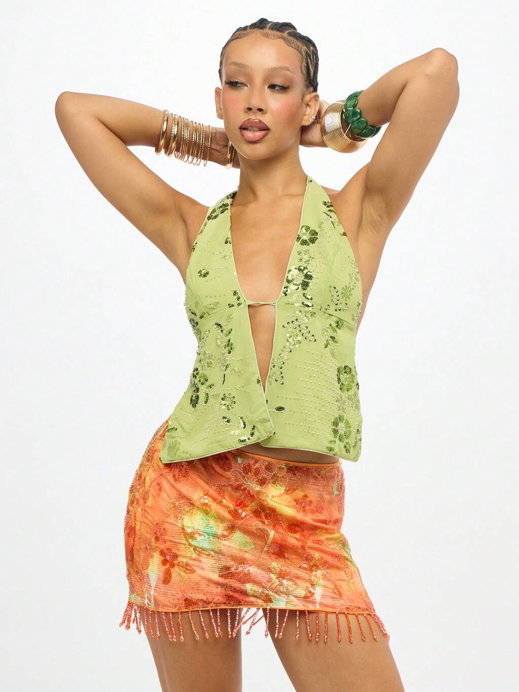 SUMWON WOMEN 추상적인 플로럴 스팽글 미니 스커트 코랄 오렌지 비즈 프린지 헴 클럽 파티 페스티벌 해변 여름 하와이 하단 헴