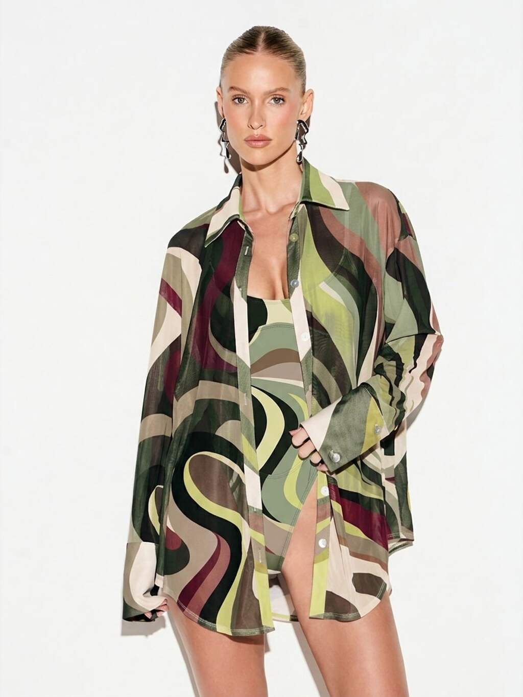 KIZN 소용돌이 프린트 메쉬 비치 버튼 업 셔츠 오버사이즈 긴팔 여름 커버업 경량 휴가 리조트웨어 추상 패턴 블라우스