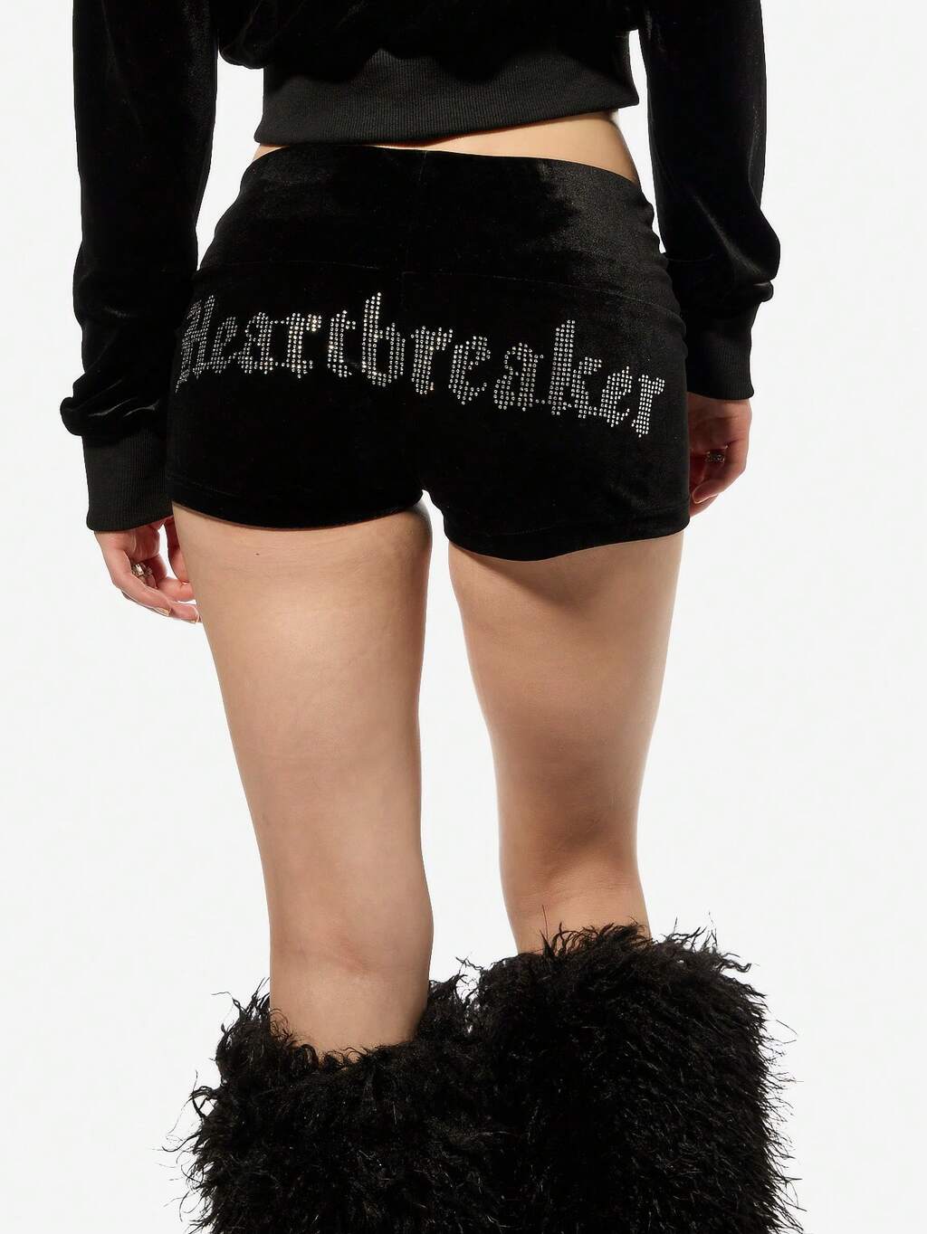 SUMWON WOMEN 할로윈 고딕 파티 클럽 벨벳 핫 팬츠 라인스톤 텍스트 디테일 및 퍼리 부츠 페스티벌 레이브 반바지