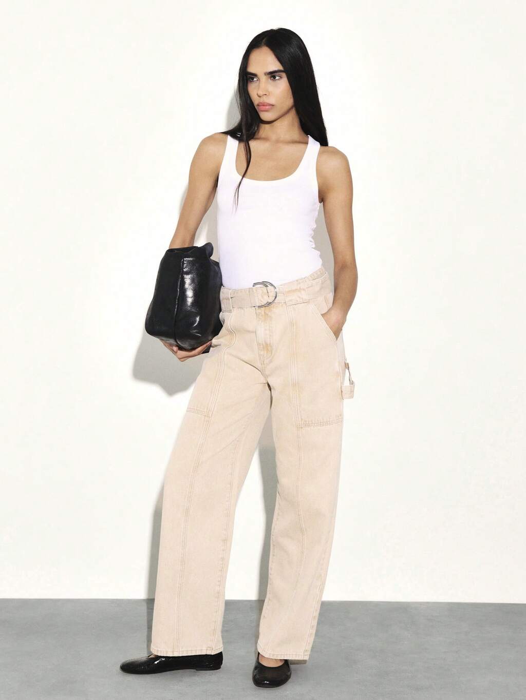 KSTM 하이 웨이스트 벨트 유틸리티 카고 진 와이드 레그 릴렉스 핏 페이퍼 백 웨이스트 캐주얼 에브리데이 데님 팬츠