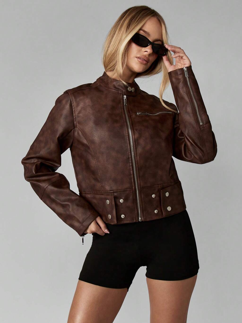 MISSGUIDED Brown Leather Motorcycle Jacket With Side Zips