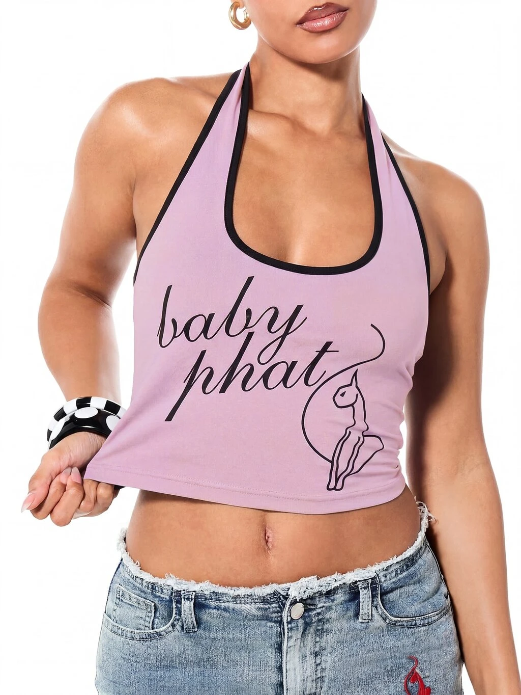 BABYPHAT Metal Trim Detail Halter Neck Cami Top With O-Ring Hardware And Script Print Pattern Sleeveless Summer Tank
