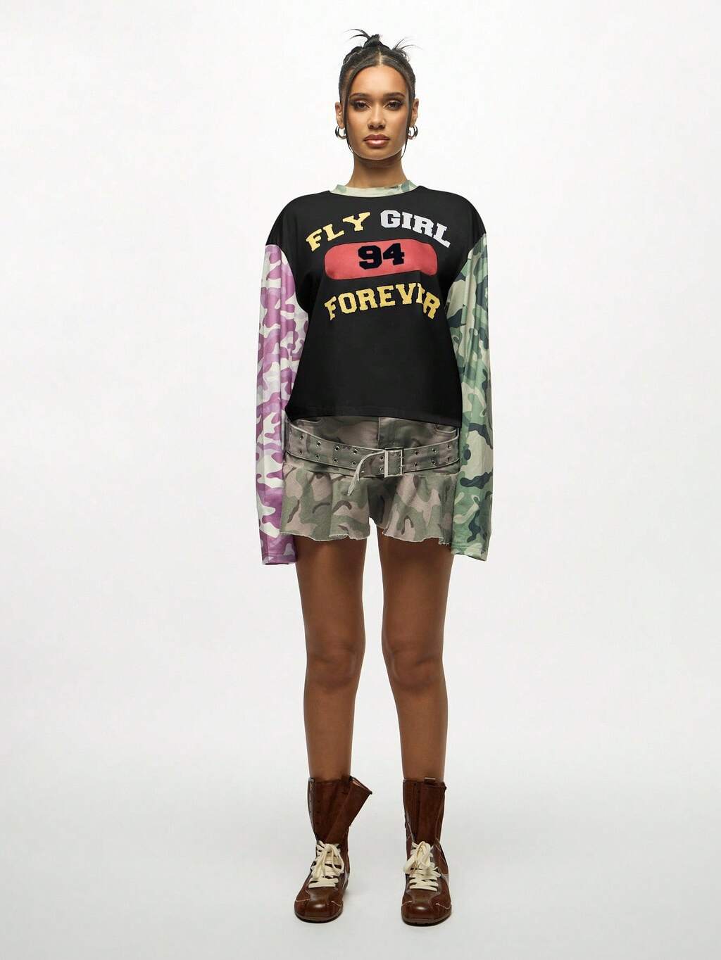 SUMWON WOMEN Vintage Style Camo Long Sleeve Graphic Tee Fly Girl Forever 94 Print Camouflage Sleeves Ruffle Waist Military Look Streetwear Fashion