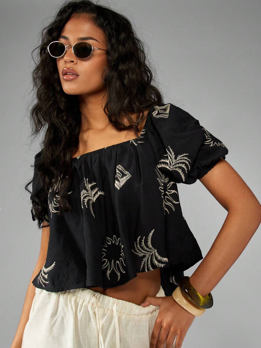 MISSGUIDED Embroidered Off Shoulder Puff Sleeve Boho Casual Crop Top