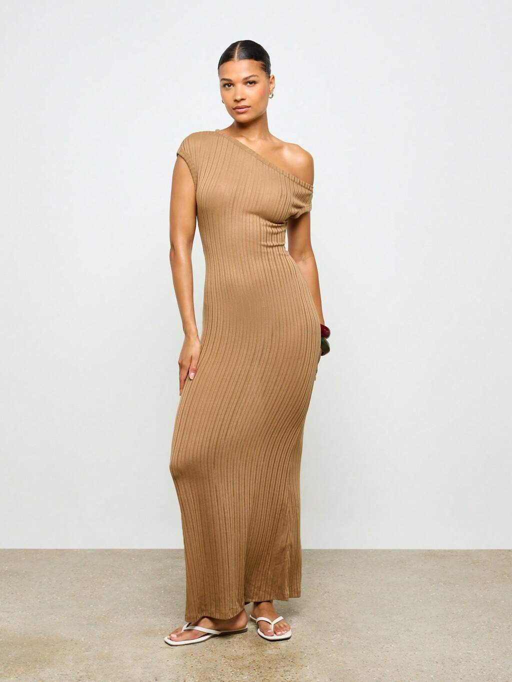 AiiRZ Ribbed Knit One Shoulder Maxi Dress Form Fitting Slim Cut Fall Winter Long Length Evening Party Bodycon Lounge Wear
