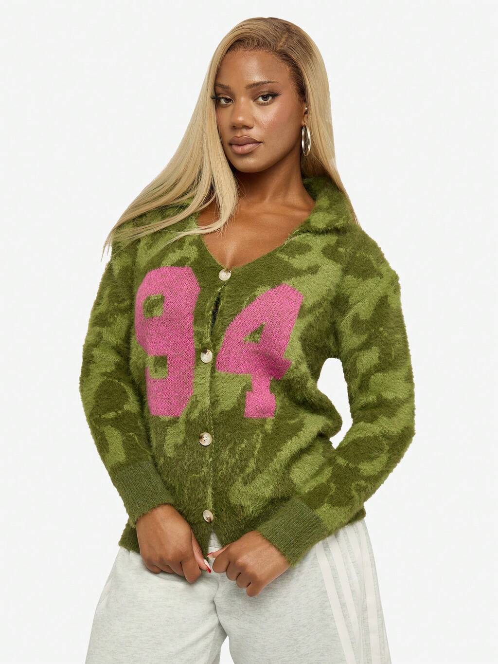 SUMWON WOMEN Fuzzy Knit Y2K Varsity Number 94 Cardigan Button Front Winter Autumn Long Sleeve V Neck Preppy College Style Knitted Cozy Sweater