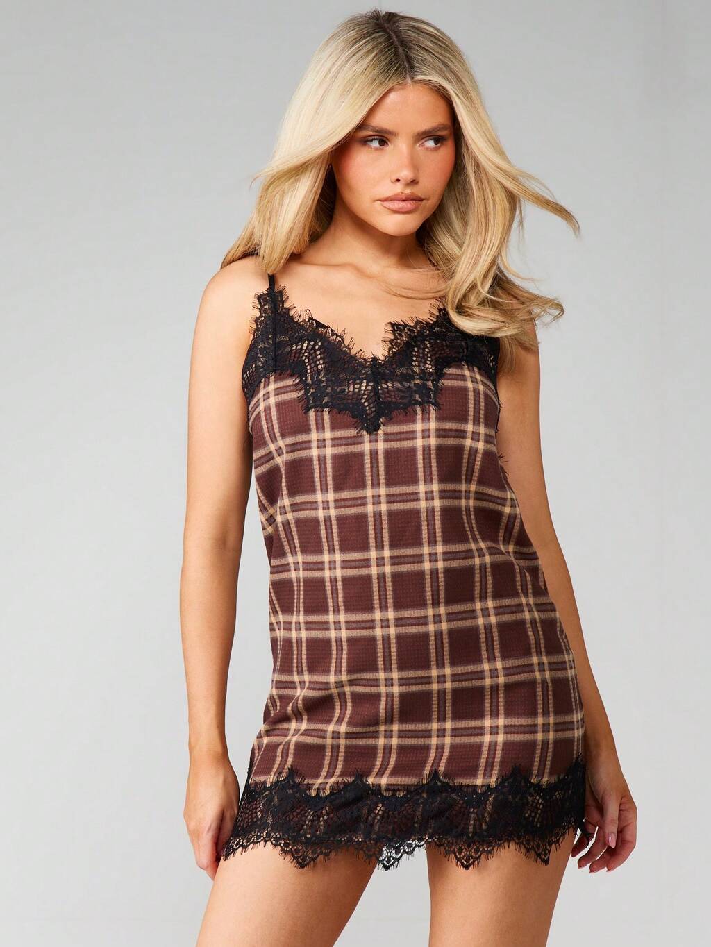 MISSGUIDED Sukienka mini w kratkę z koronkową lamówką