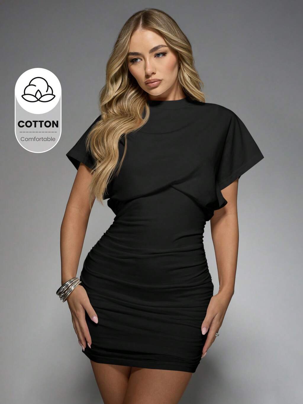 MISSGUIDED Elegancka, marszczona, dopasowana mini sukienka z wysokim dekoltem i krótkim rękawem