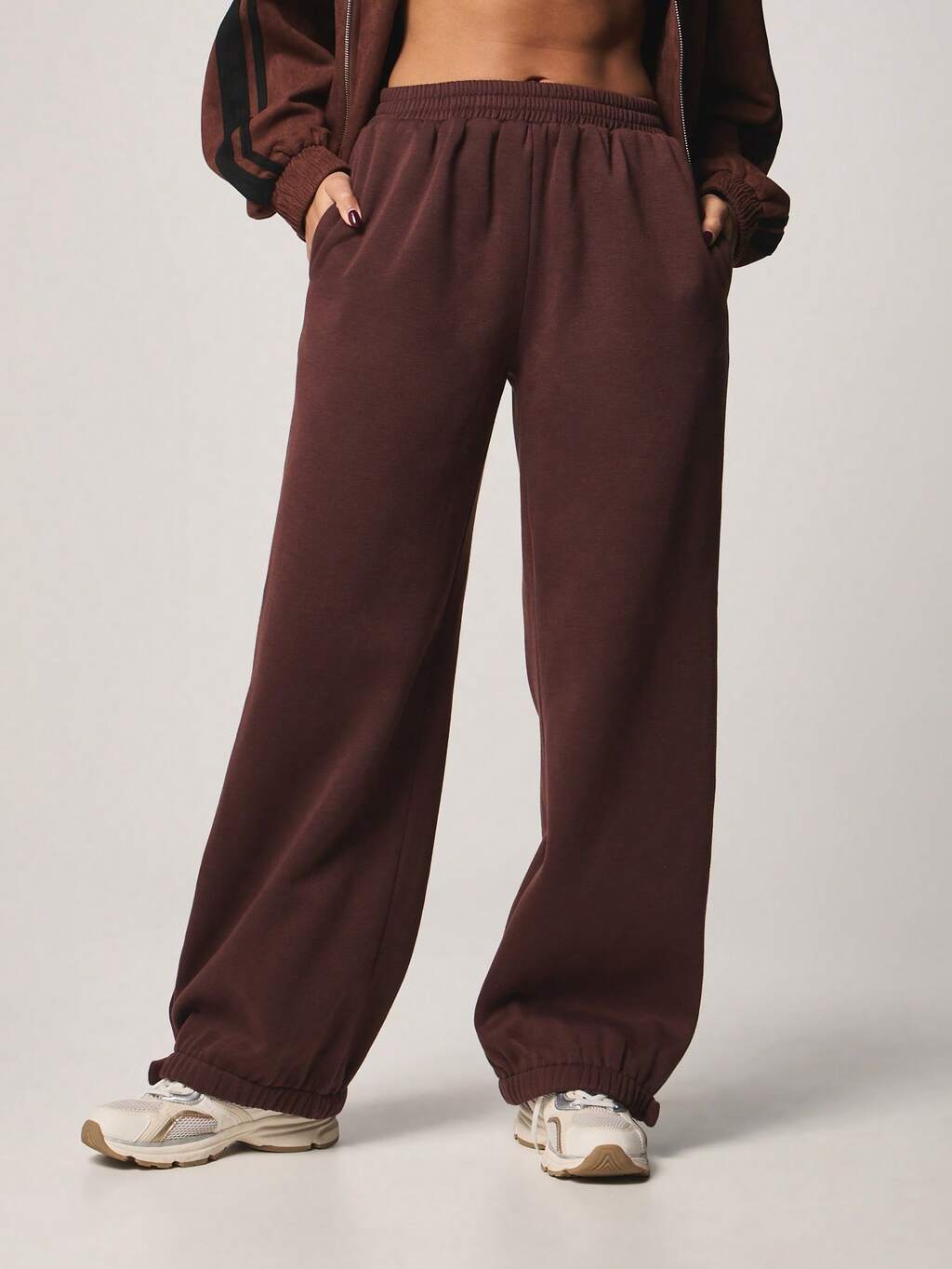 AiiRZ Wygodne, luźne spodnie dresowe z szerokimi nogawkami w stylu beczkowym i elastyczną talią ze sznurkiem. Luźny, swobodny strój do wypoczynku.