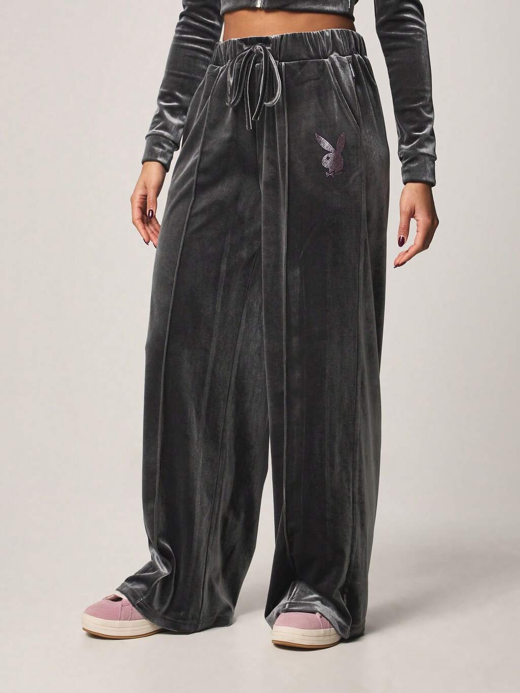 Missguided x Playboy Szerokie aksamitne spodnie dresowe z logo z kryształkami
