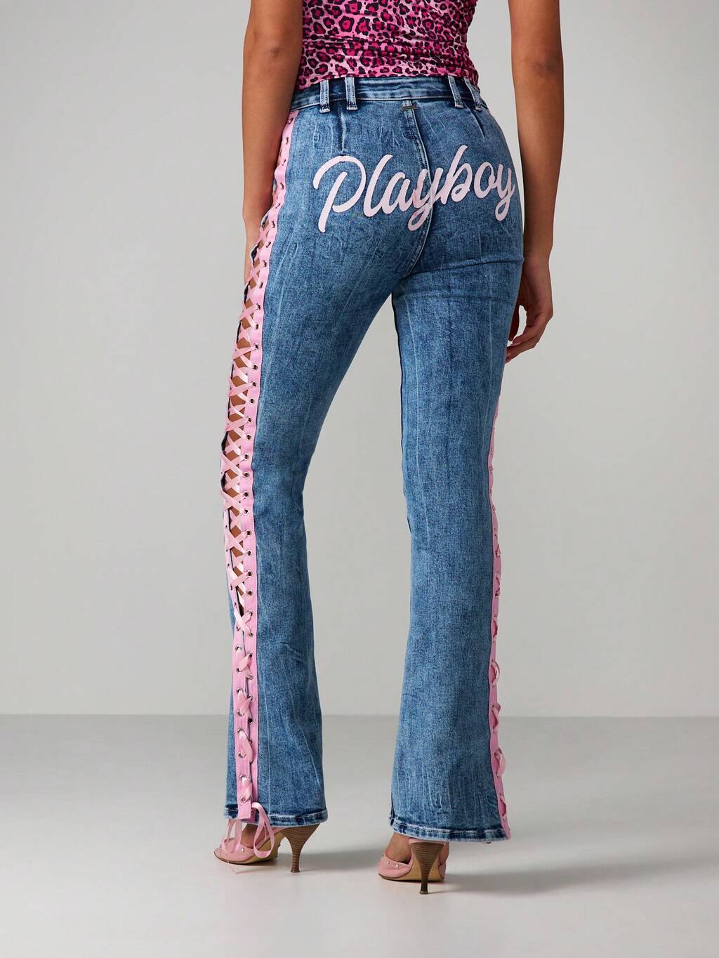 Missguided x Playboy Jeansy z wysokim stanem i rozszerzanymi nogawkami, ze sznurowaniem