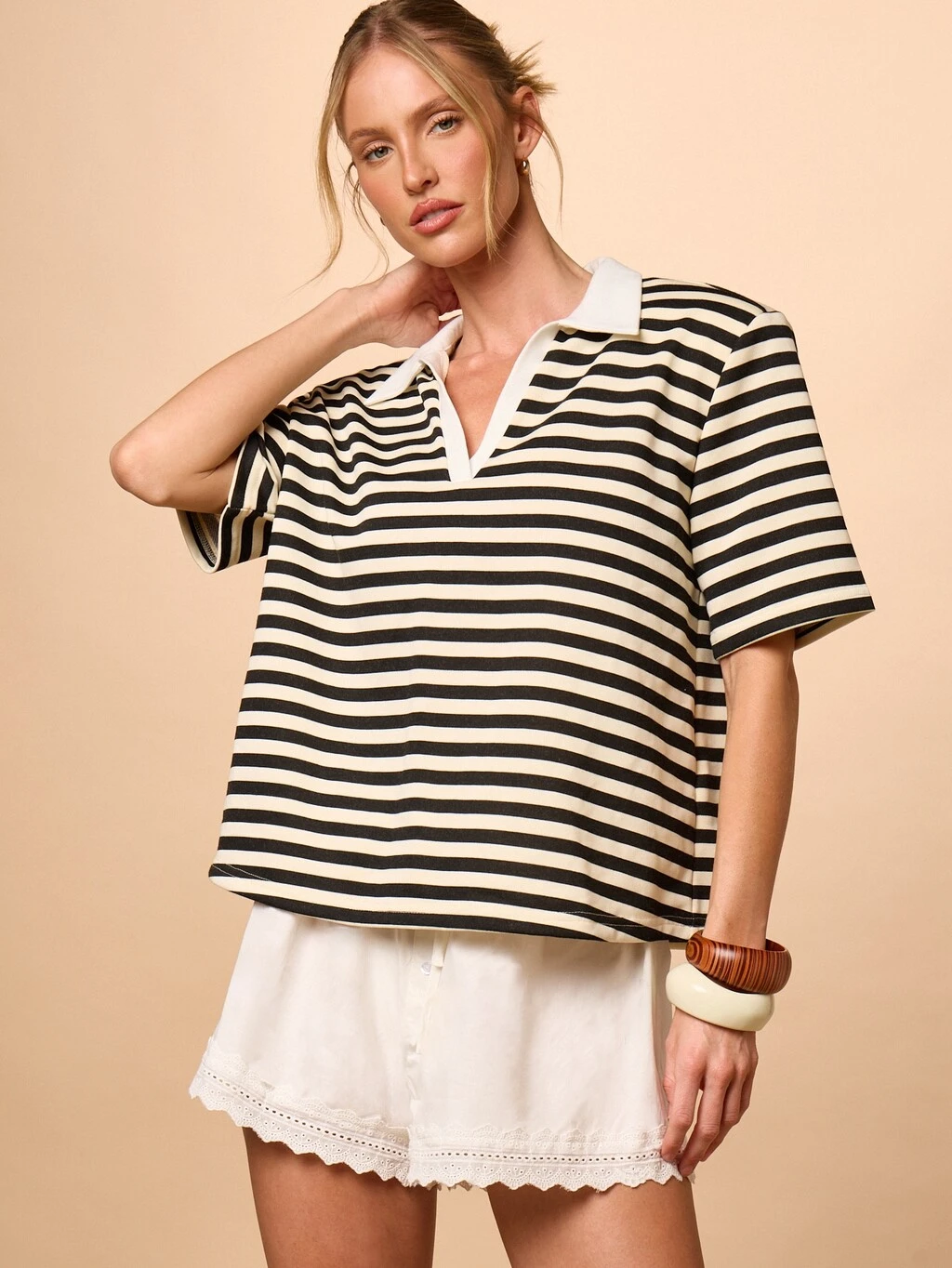 AiiRZ Damska koszulka polo w paski z krótkim rękawem i kontrastowym białym wykończeniem, swobodna, letnia