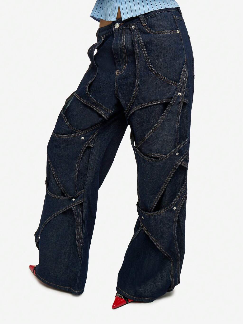 KIZN Jeansy damskie z szerokimi nogawkami i ćwiekami, z wysokim stanem i metalowymi ćwiekami, modne i wyraziste