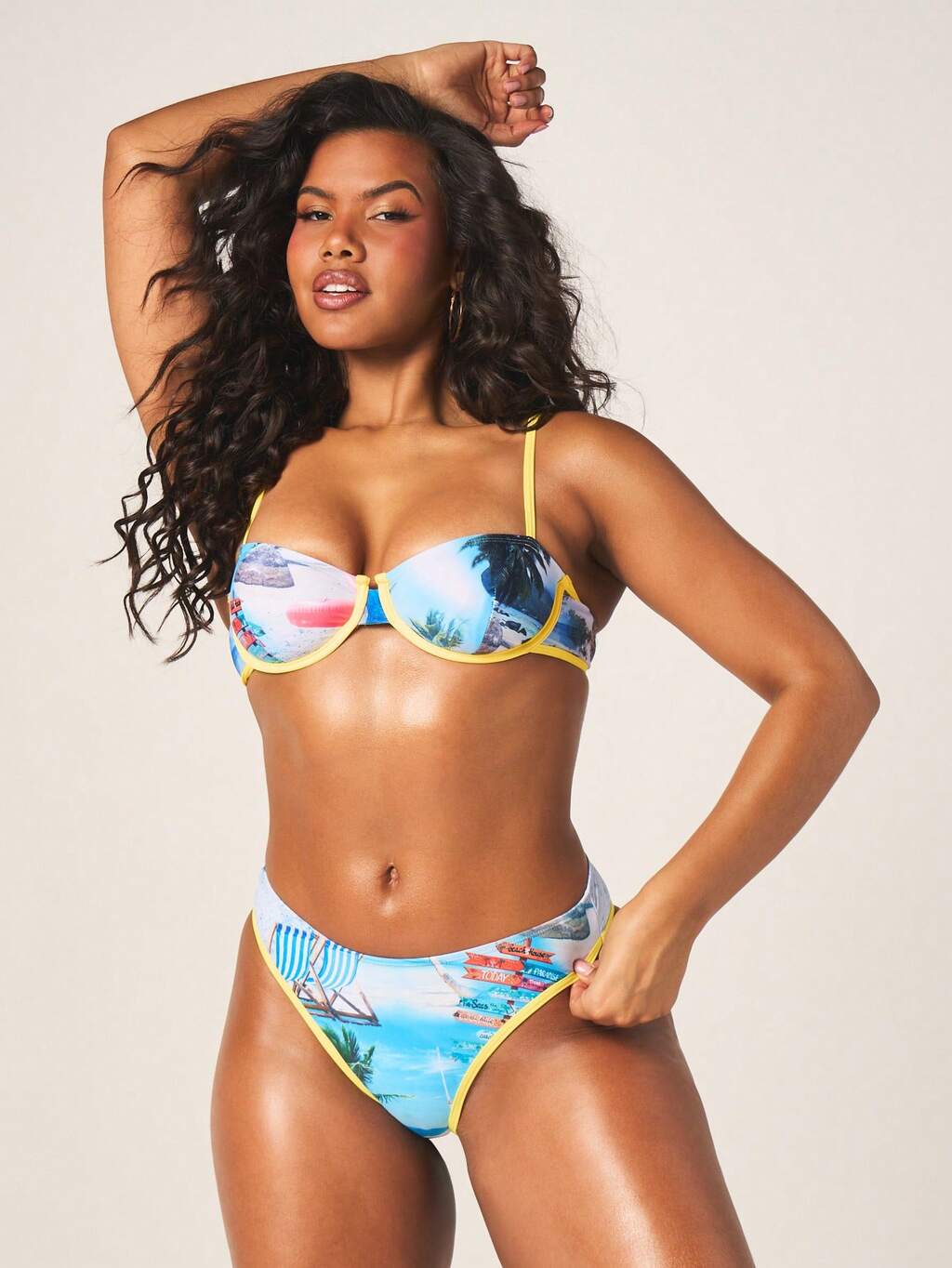 MISSGUIDED Góra bikini typu bandeau z nadrukiem plażowym i żółtym wykończeniem
