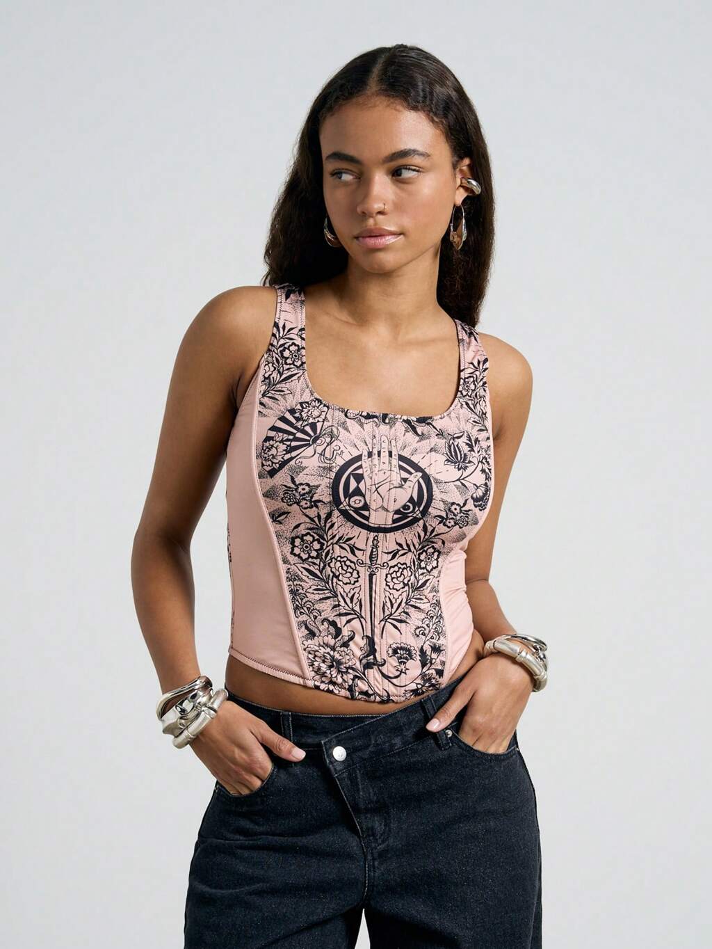 AiiRZ Gorset bez rękawów z nadrukiem tatuażu, dekolt w łódkę, dopasowany