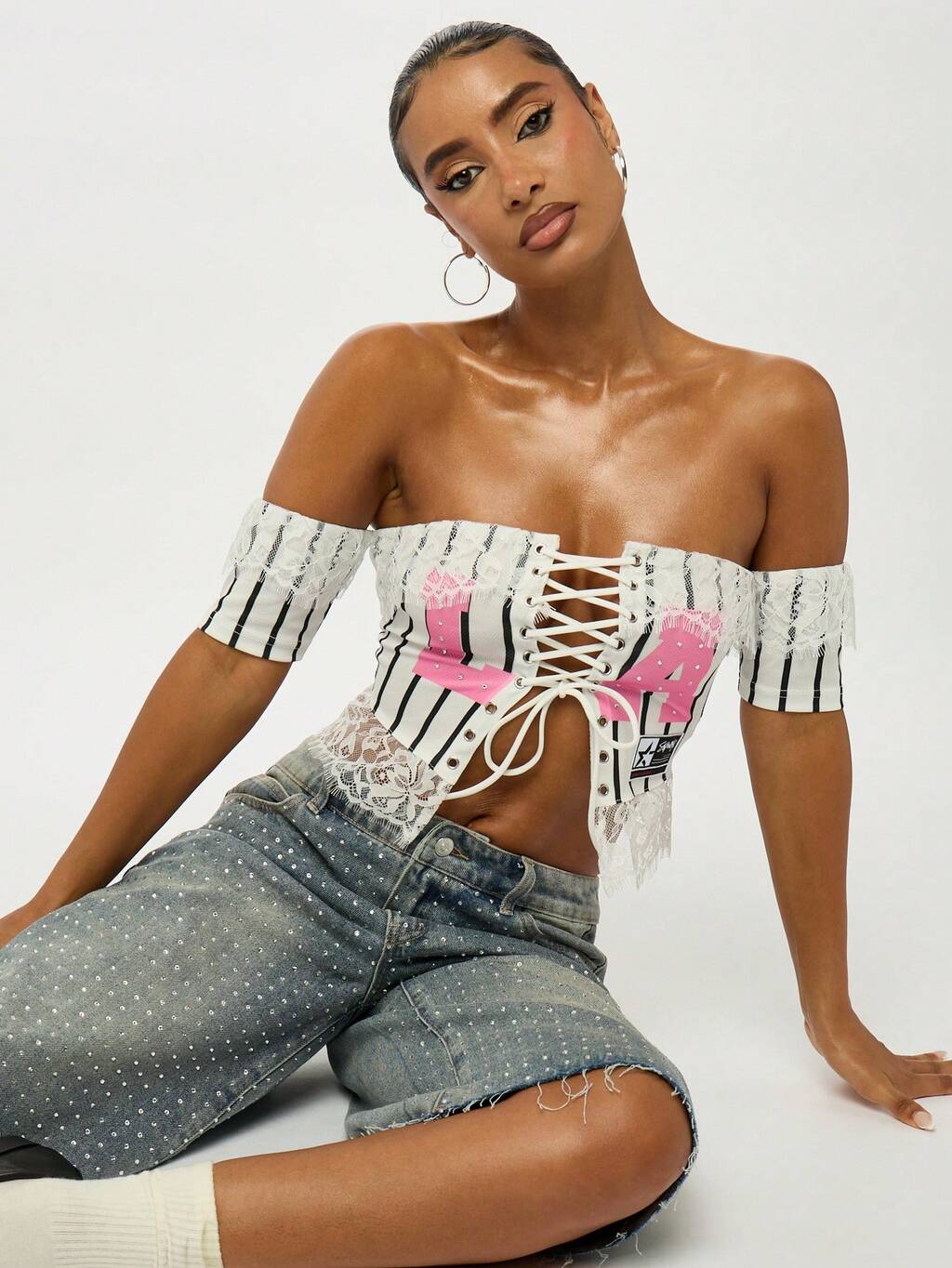 SUMWON WOMEN Gorset z odkrytymi ramionami, sznurowany, w paski, z białym wzorem klawiszy fortepianu, modny, retro, szykowny, estetyczny, z krótkimi rękawami, elegancki, na wieczorne przyjęcie, klubowy strój