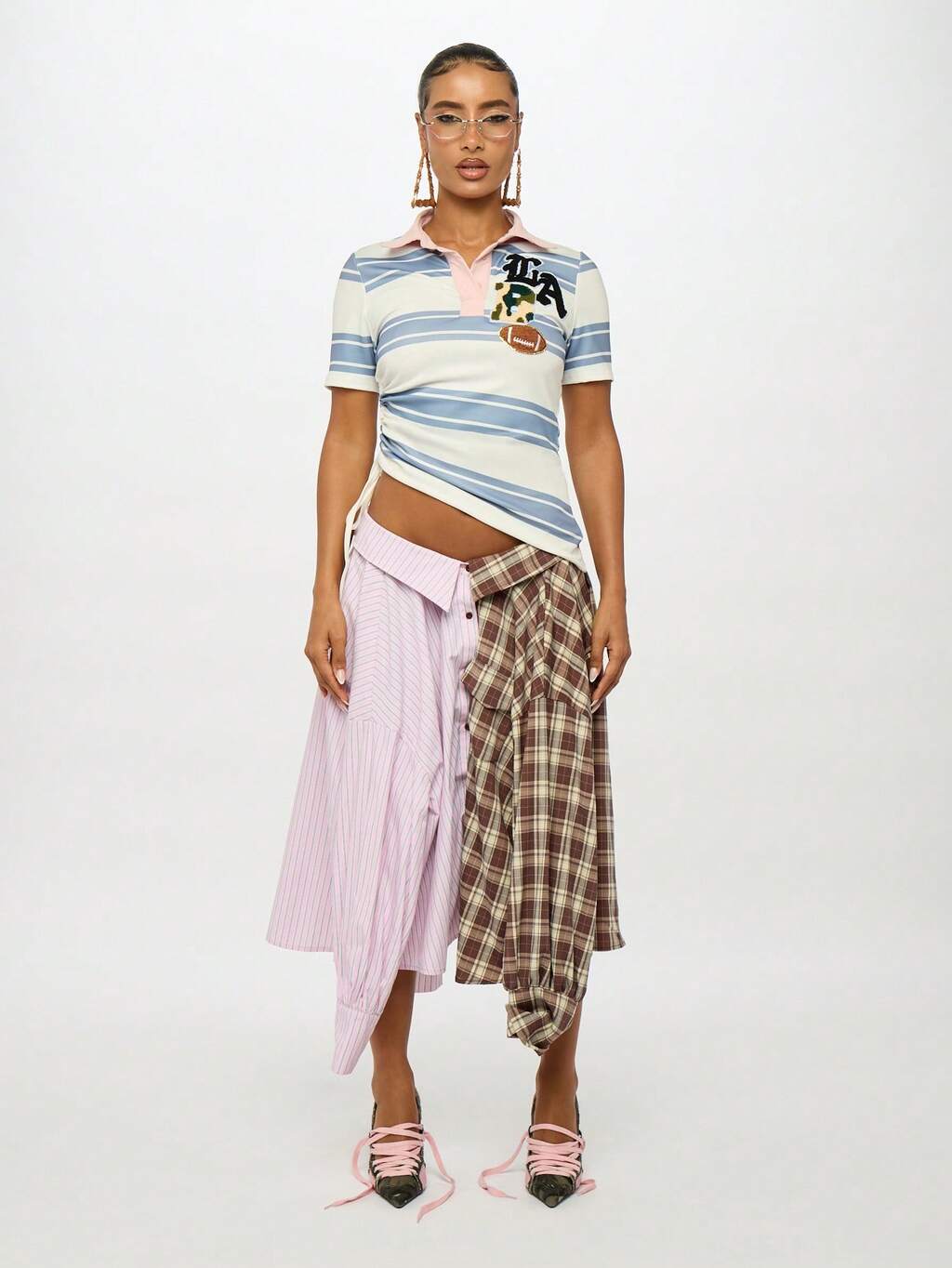 SUMWON WOMEN Koszulka polo z logo i odznaką piłkarską w stylu retro, w stylu uniwersyteckim, w niebieskie paski, w stylu uniwersyteckim, wiosenno-letnim