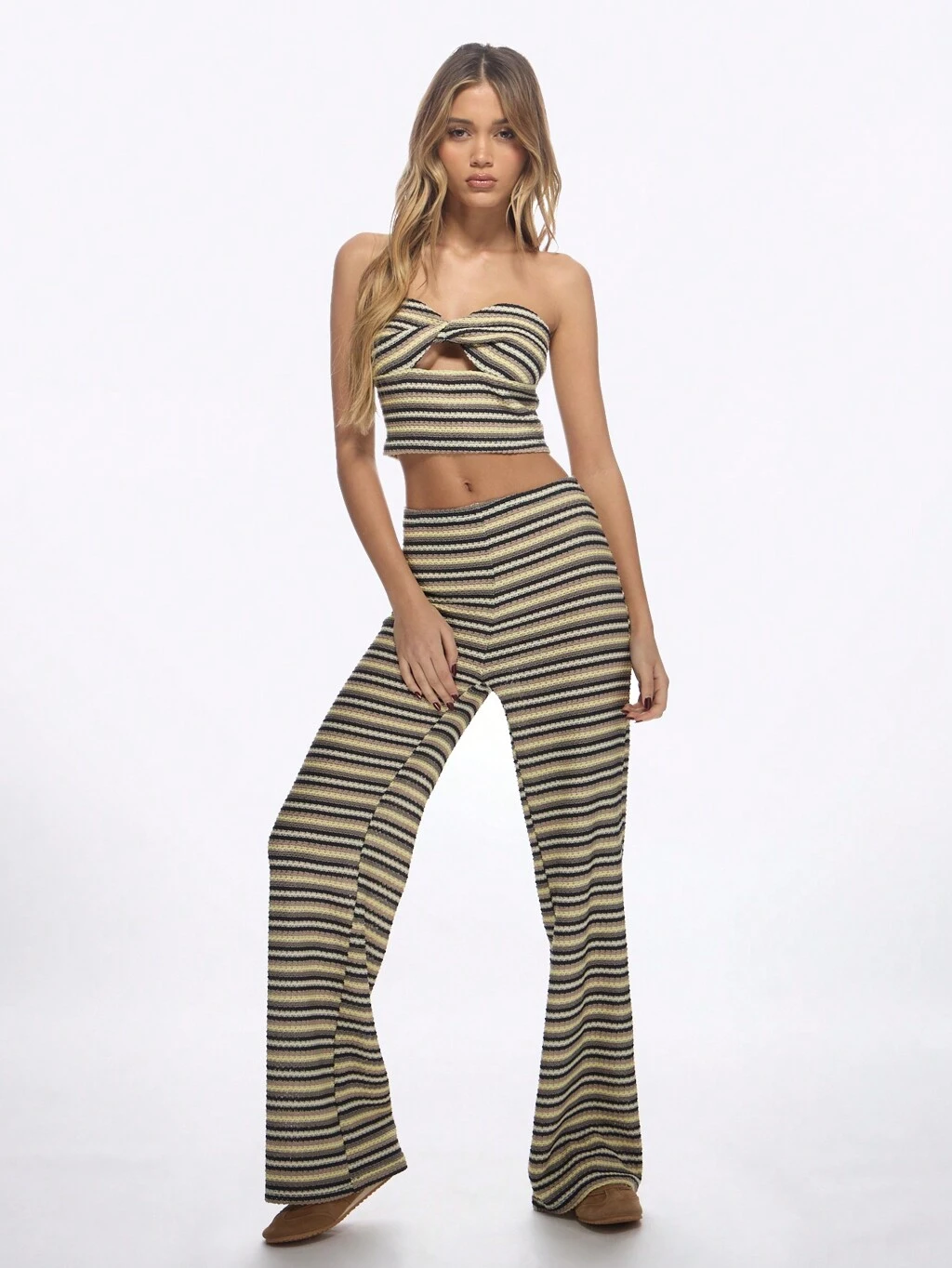 MISSGUIDED Dwuczęściowy komplet z pasiastym, szydełkowym topem i rozszerzanymi spodniami