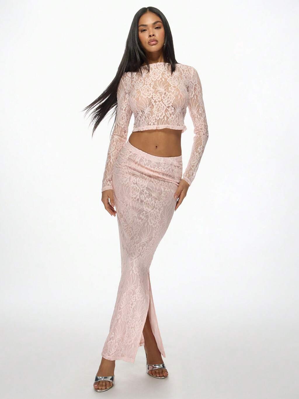 MISSGUIDED Koronkowy dwuczęściowy komplet z długim rękawem i krótką spódnicą maxi